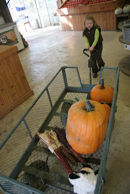 Our loot from the pumpkin hunt. Plus three Indian Corn and a small stuffed cow from home.